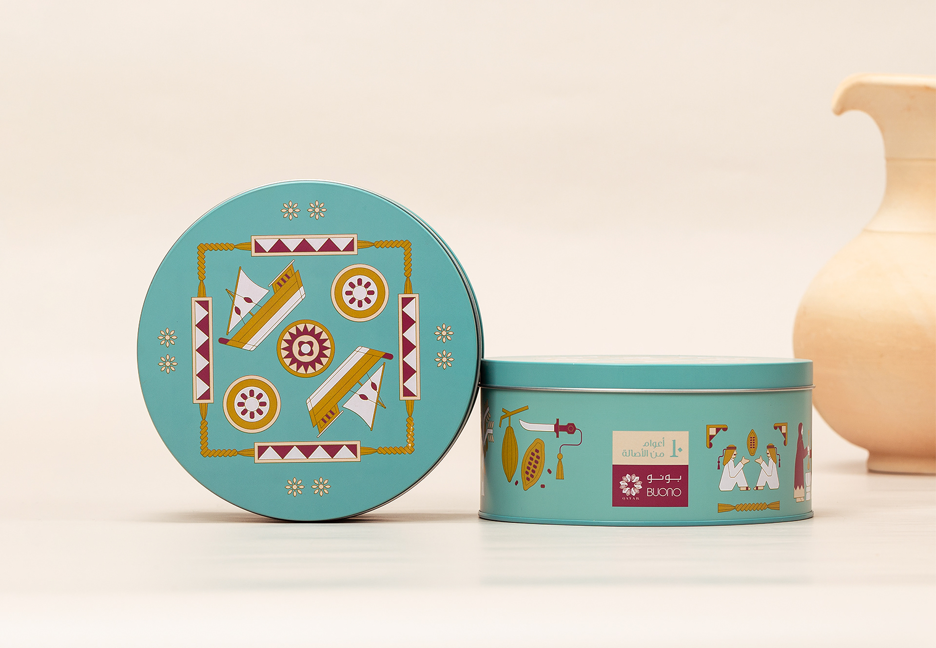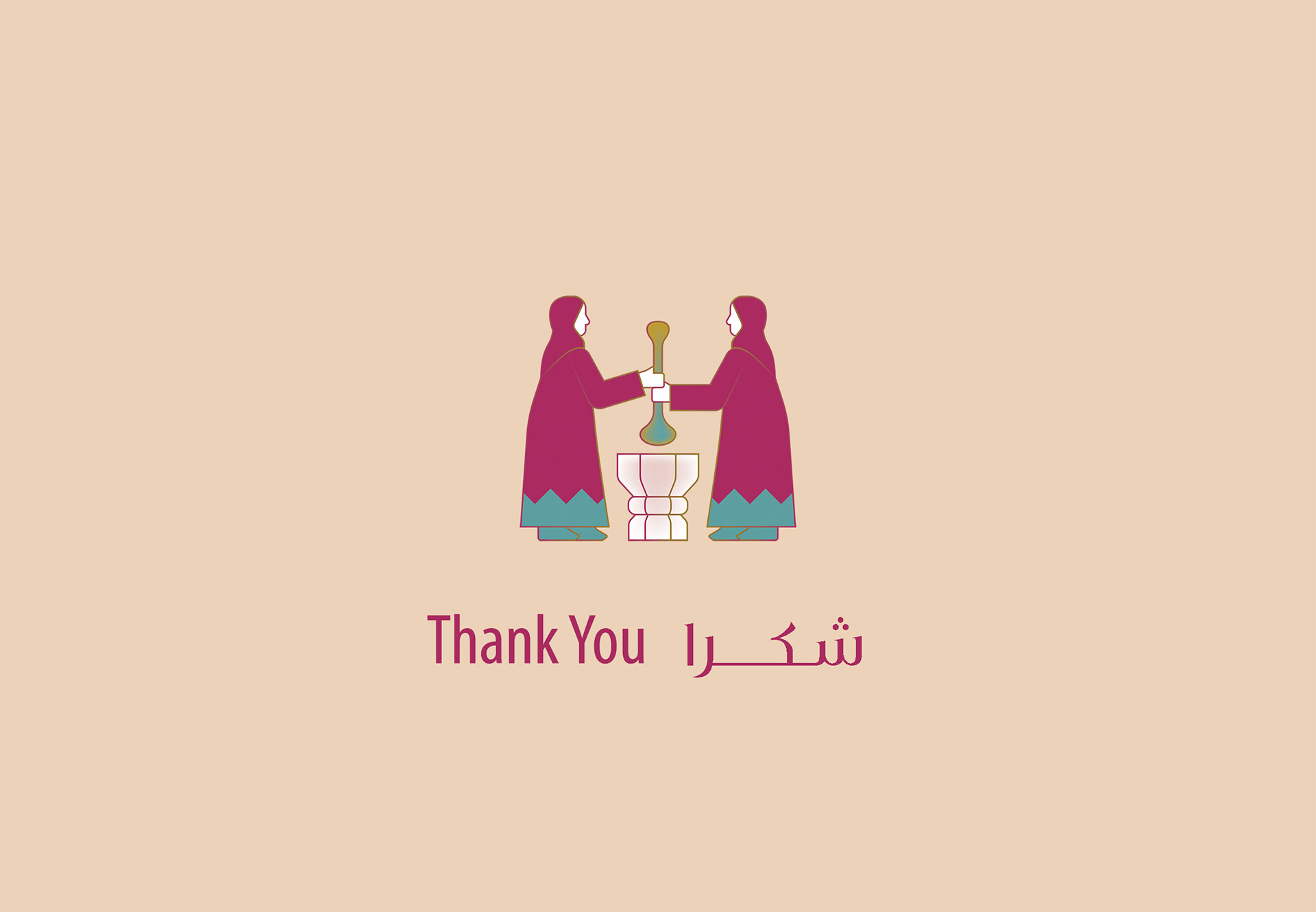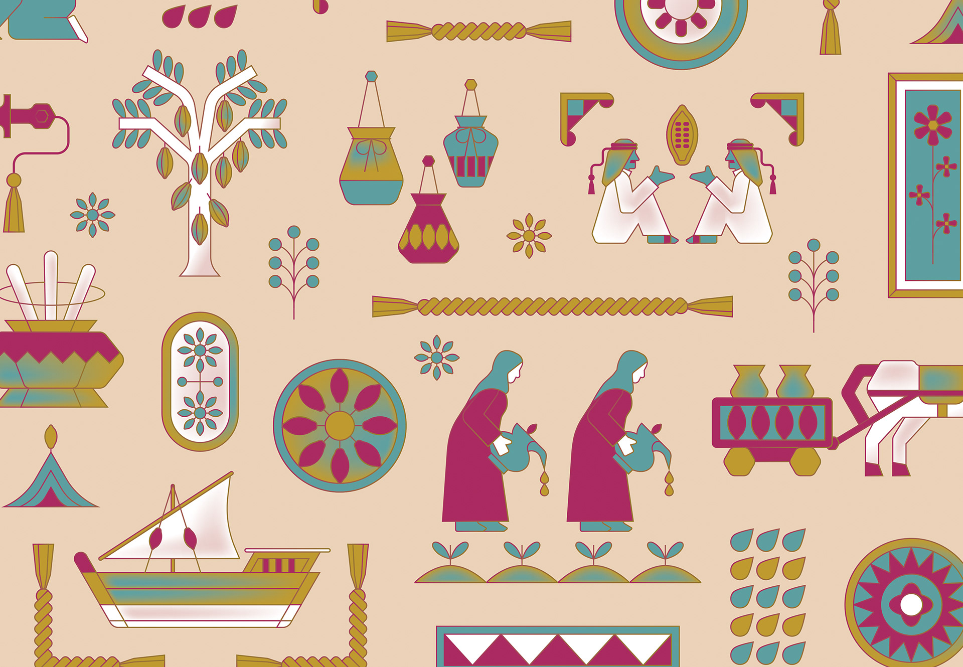 From planting chocolate seeds all the way to the end result of chocolate. I wanted the illustration to express snippets of the process such as stirring the mixture, watering, adding milk and sugar and all the way to packing. The Qatari flavor comes in with the attire, the subtle patterns and cultural objects.