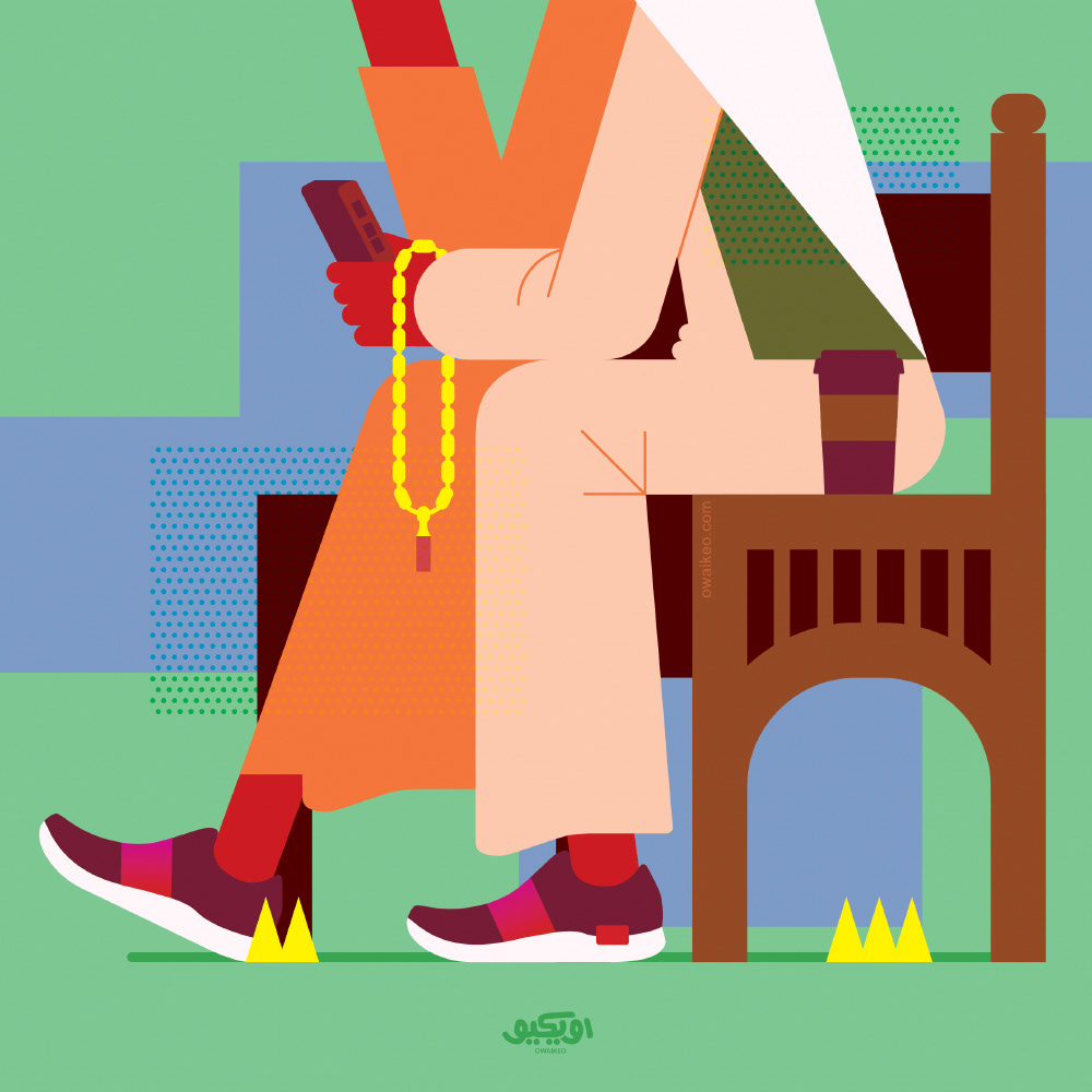 "Dish-dasha" is the men's wear that we call here in Kuwait. What was very traditional and formal is now more casual and trendy. People wear sneakers and accessories that kind of bridge the old and new. This is my minimalist illustration visualizing that.