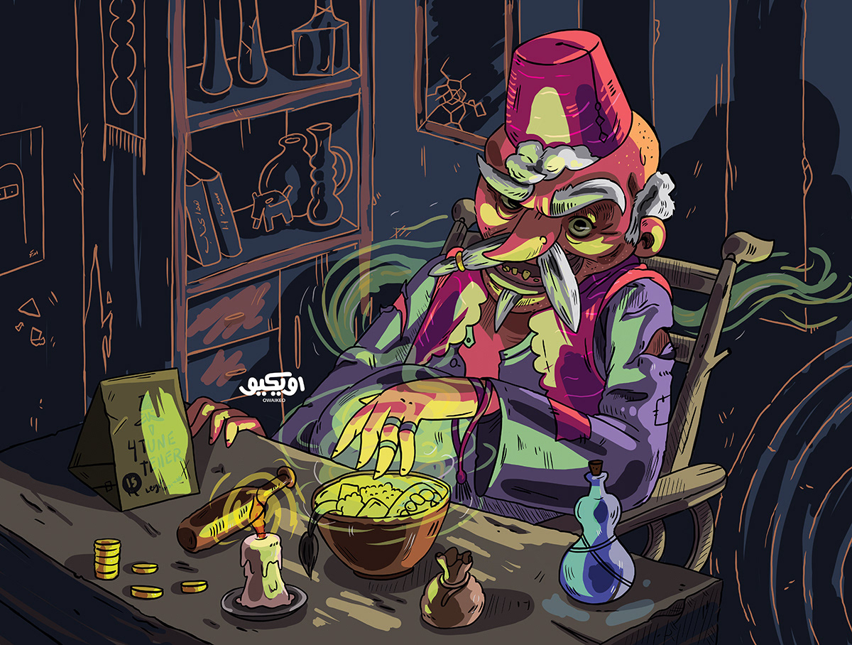 A fortune teller from a fantasy version of Arabia. Mixing herbs and hallucinating his visitors. In this artwork I wanted to explore a different style with emphasis on light composition.