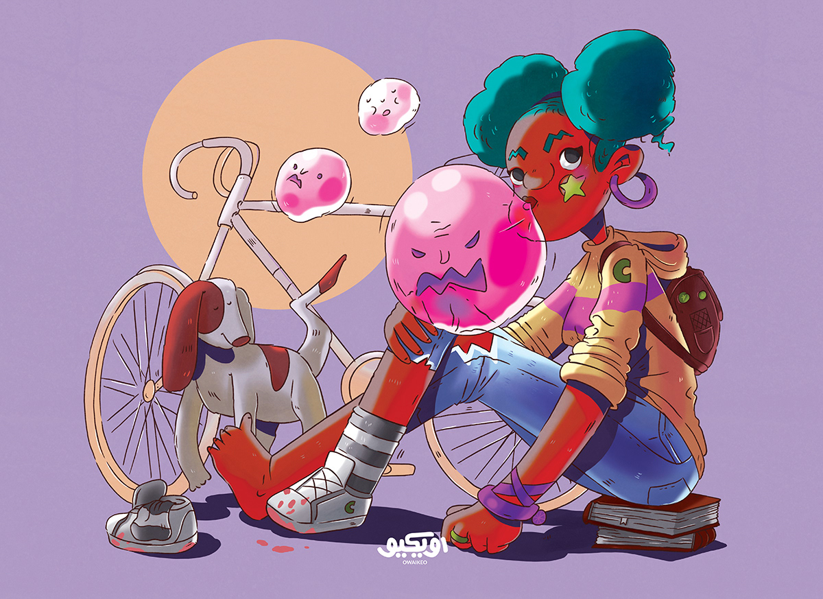 Mia is a girl who can summon allies through bubble gums, each with their own personality, Angry, Frowny and Sleepy .. and oh the puppy likes to hang out.