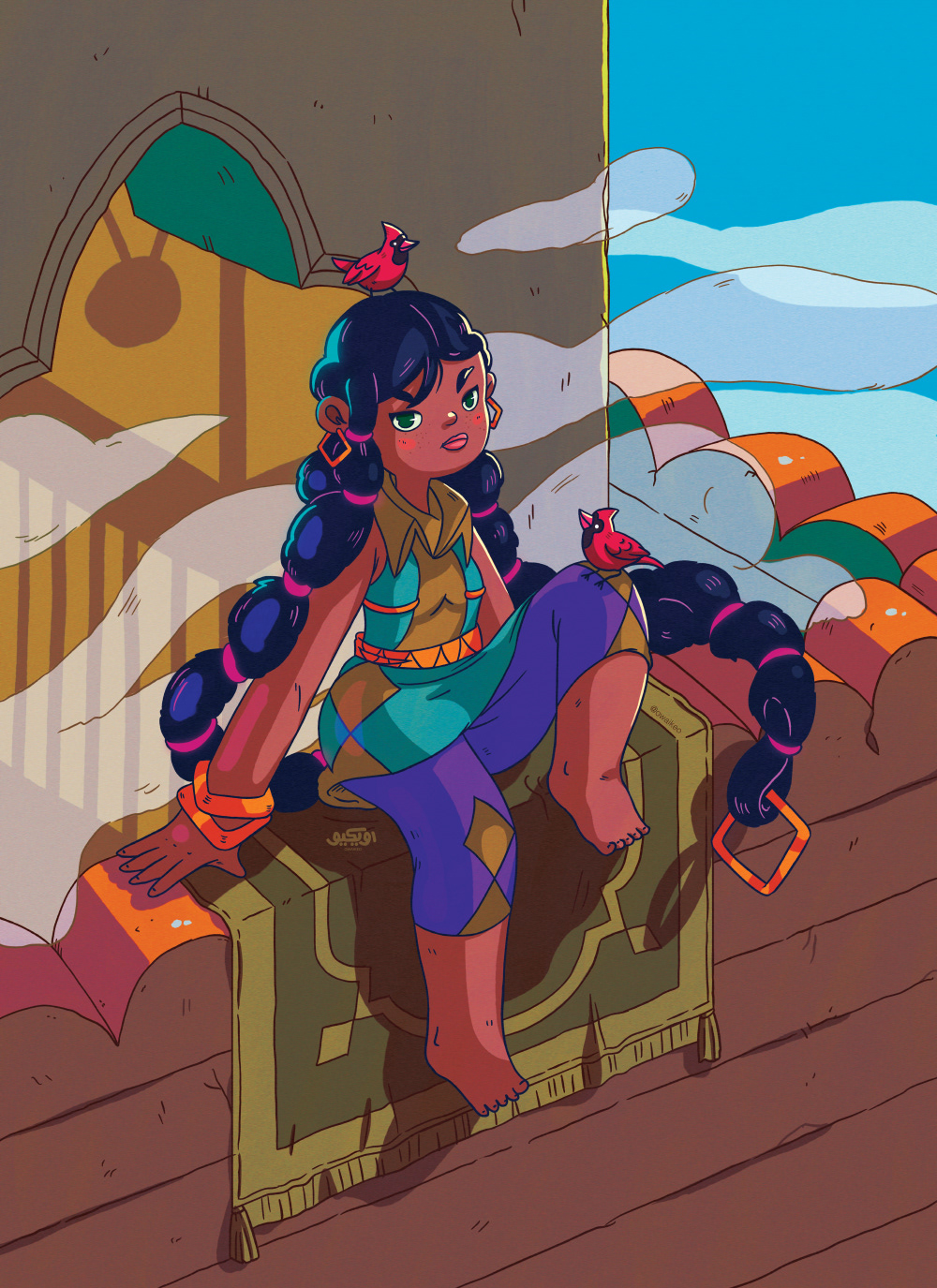 This is my latest character design and development, Sheikha. She was born with a condition where she can move her hair as individual limbs and when tied together they create a strong bond.